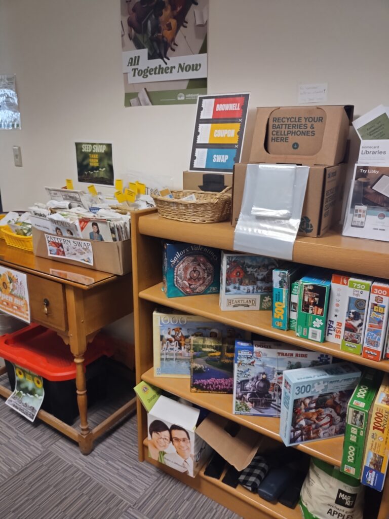 There are many ways for the public to participate and take advantage of this work. The library participates in a battery recycling program that allows patrons to drop off their old batteries. There are also ongoing and seasonal swaps for puzzles, sewing patterns, yarn, fabric, costumes, and toys and we host a Repair Cafe twice a year.