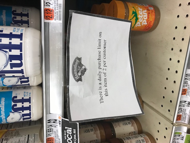 A sign at Hannaford supermarket near the fluff and peanut butter that indicates that "There is a daily purchaser limit on this item of 2 per customer"
